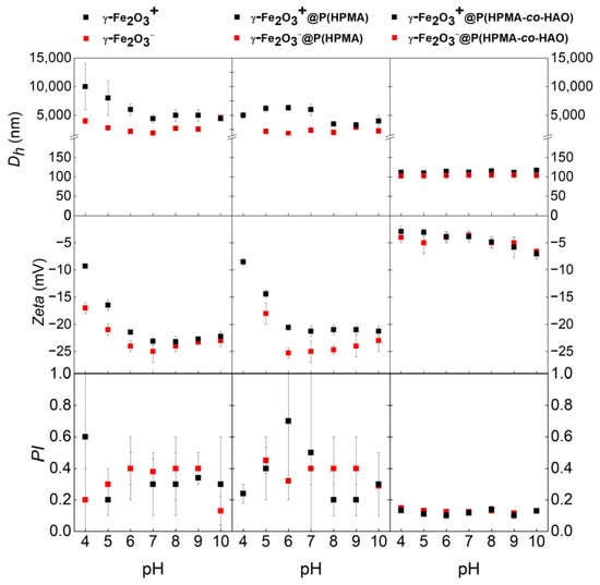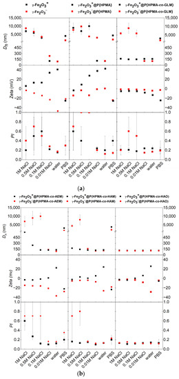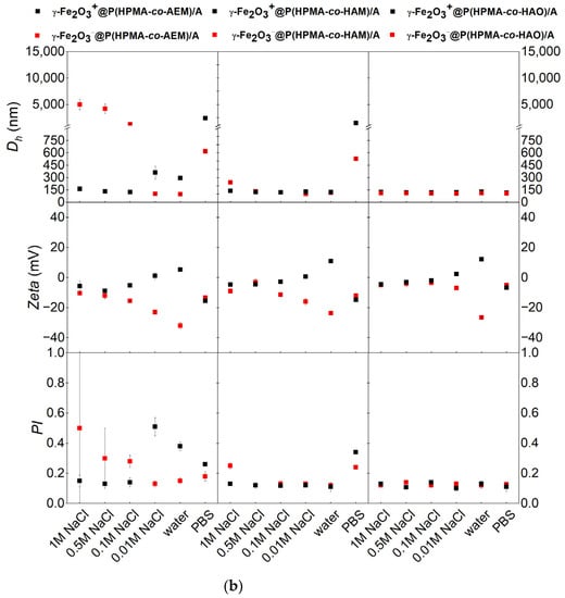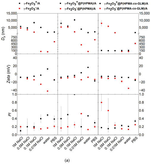 The polymer coating containing carboxylic- and amino-anchoring functional groups (γ-Fe2O3⨁/⊖@P(HPMA-co-GLM) and γ-Fe2O3⨁/⊖@P(HPMA-co-AEM)) improved the colloidal stability of nanoparticles only under limited conditions (Scheme 1a,b). Nanoparticles γ-Fe2O3⊖@P(HPMA-co-GLM) and γ-Fe2O3⨁@P(HPMA-co-AEM) were stable in water and at slightly elevated ionic strength (Tables S6 and S7 in Supplementary Material). In the cases of γ-Fe2O3⨁@P(HPMA-co-GLM) and γ-Fe2O3⊖@P(HPMA-co-AEM), the presence of the polymer results in the partial precipitation of the mixture, even in the water (Tables S5 and S8 in Supplementary Material), which can be ascribed to compensation of surface charges, as we mentioned above. This behavior documents the fact that neither the carboxylic group nor the amino group is a sufficiently powerful anchoring group for steric stabilization of the maghemite nanoparticles at higher ionic strength. In the presence of electrolyte, the polymers seem to leave the coordination sphere of the maghemite surface iron atoms rapidly.