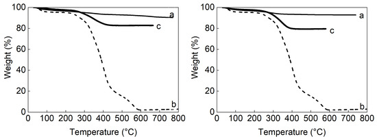 TGA was performed in air using a Perkin Elmer TGA 7 analyzer (Norwalk, CT, USA) with 10 °C·minute−1 heating step from 30 to 800 °C. In a standard procedure, aqueous solution of P(HPMA-co-HAO) (30 mg, 0.8 mL) was added to a magnetic colloid γ-Fe2O3⨁/⊖ (1 mL, 60 mg/mL), and the resulting stabilized colloids were shaken for 15 min. The magnetic particles were separated by repeated (4×) centrifugation/redispersion (4 h, 10,000 rpm) and lyophilized afterwards.
