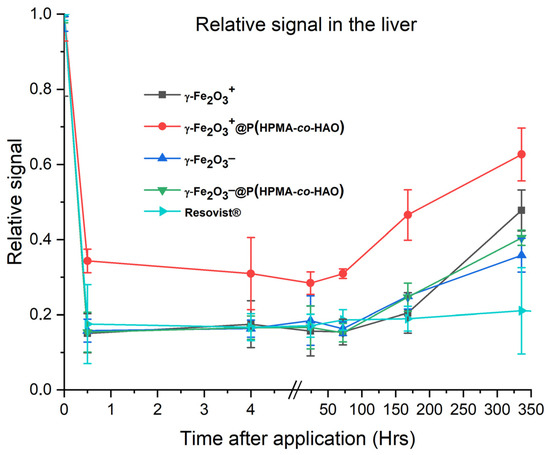 As a proof of principle, the chosen coated nanoparticles were tested as contrast agents for MRI. Their elimination and persistence in tissues, as well as the rate of their elimination were compared with a commercially available contrast agent [68].