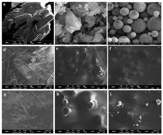 SEM of (a) FBP, (b) RHCl, (c) M3, (d,g) L15, (e,h) F1, and (f,i) F2. See Supplementary Figure S1 for optical images.