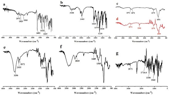 FTIR Spectra of (a) FBP, (b) RHCl, (c) EC, (d) Lycoat® RS780, (e) M3, (f) F1, and (g) F2.