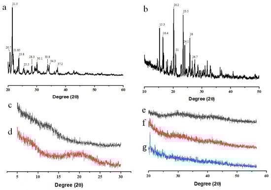 XRD of (a) FBP, (b) RHCl, (c) EC, (d) Lycoat® RS780, (e) M3, (f) F1, and (g) F2.