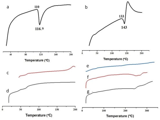 DSC of (a) FBP, (b) RHCl, (c) EC, (d) Lycoat® RS780, (e) M3, (f) F1, and (g) F2. The onset temperature of FBP and RHCl was 110 and 133 °C, respectively.