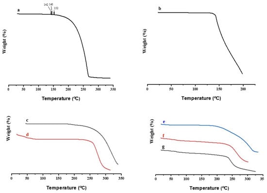TGA of (a) FBP, (b) RHCl, (c) EC, (d) Lycoat® RS780, (e) M3, (f) F1, and (g) F2.