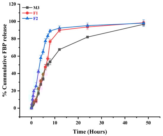 I In vitro FBP release from MPs (M3) was assessed using a dialysis membrane as described by Gajra, et al. [] with some modification. About 10 mg of M3 containing ~2.5 mg of FBP was added to the cellulose acetate membrane (MWCO 10,000 Da) with 10 mL of PBS (pH 6.8). Both ends were sealed and placed in 200 mL of PBS at a 6.8 pH with continuous stirring at 50 rpm and 37 ± 2 °C to simulate oral cavity conditions. After 5 min, the pH of the media changed to 1.2 (0.1N HCl) for 2 h and then switched to pH 6.8 (PBS) to simulate intestinal conditions, and the study was continued for 48 h. At designated intervals, 5 mL of aliquot was withdrawn, filtered through a 0.45 µm syringe filter, and immediately analyzed by a UV-Visible spectrophotometer at 247 nm. Every time the withdrawn volume was replaced with an equal volume of a preheated fresh dissolution medium. All experiments were performed in triplicate.