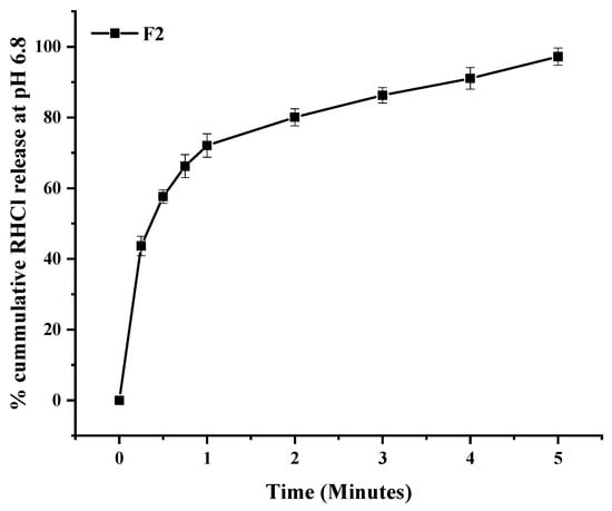 The in vitro FBP release from F1 and F2 was accomplished as described in Section In Vitro FBP Release from MPs. For RHCl release from F2, samples from the first five minutes of release at pH 6.8 were analyzed at 315 nm. The release was performed in triplicate, and the mean was considered.