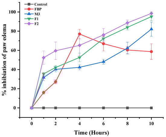 Carrageenan-induced rat paw edema was employed to investigate the anti-inflammatory activity. Albino Wistar rats weighing 150–200 g of either sex were divided into 5 groups (n = 3). The paw diameter of all the rats was determined using a digital Vernier caliper before giving any treatment or anti-inflammatory agent. Afterward, the first group received a 0.5% carboxymethyl cellulose (CMC) solution, the second received pure FBP, the third received M3, the fourth received F1, and the fifth received F2 orally. Pure FBP and M3 were suspended in 0.5% of a CMC solution given via a cannula. Composite films were cut into pieces and directly placed in the rat’s mouth using forceps. After one hour of treatment, acute inflammation was induced in the left hind paw via the intraplantar injection of 0.1 mL of freshly prepared 1% carrageenan solution in normal saline. The linear paw circumference was monitored for 10 h, and the percentage of inhibition was calculated as follows [].