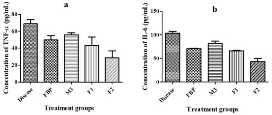 For the quantification of TNF-α and IL-6 in the rat serum, blood samples were collected by a cardiac puncture from an anesthetized rat in an Eppendorf tube and kept for 15 min. Afterward, the blood was centrifuged at 10,000 rpm for 15 min. The serum was collected in Eppendorf tubes with the help of a micropipette and preserved at −20 °C for cytokine estimation. The rat-specific enzyme-linked immunosorbent assay (ELISA) kit was purchased from Elabscience® (Wuhan, China) and used for the estimation of TNF-α and IL-6 as per the manufacturer’s instructions. The absorbance was detected at 450 nm with the ELISA plate reader [].