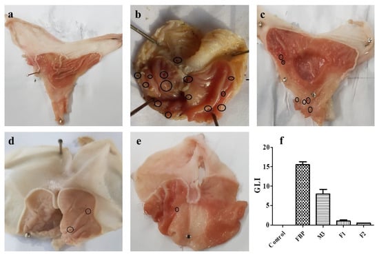 Photographs of rat stomachs from the (a) Control group, (b) Pure FBP-treated group, (c) M3-treated group, (d) F1-treated group, (e) F2-treated group, and the (f) Gastric lesion index. Error bar represents ± SD (n = 3). Black circles in figures indicate gastric ulcers. Explained in figure legends.