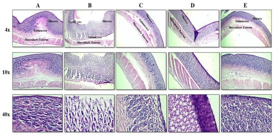 Stomach tissues from each group were sliced into thin sections, and slides were developed after treating them with a hematoxylin and eosin (H & E) stain. These slides were observed under an Accu-scope 3000-LED microscope at different resolutions [].