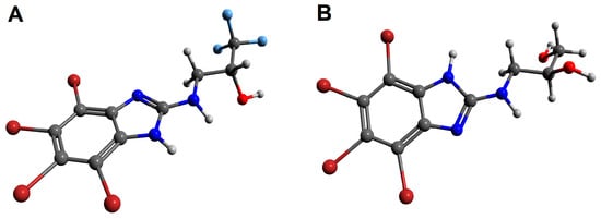 The geometries of 1,1,1-trifluoro-3-[(4,5,6,7-tetrabromo-1H-benzimidazol-2-yl)amino]propan-2-ol (rac-6, (A)) and 3-[(4,5,6,7-tetrabromo-1H-benzimidazol-2-yl)amino]propane-1,2-diol (rac-11, (B)) optimized in Avogadro v. 1.2.0. The figures rendered using POV-Ray v. 3.7.0 molecular visualization software. Nitrogen atoms are presented with blue color, oxygen atoms with red color, bromine atoms with burgundy (maroon) color, and fluorine atoms with light blue color, whereas hydrogen atoms are expressed as light grey balls.