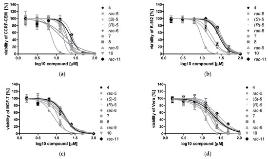 Sigmoidal dose–response curves for compounds 4–11 determined for CCRF-CEM (a), K-562 (b), MCF-7 (c), and Vero cells (d) after 48 h of treatment. Plots were generated by GraphPad Prism after fitting the MTT data to the sigmoidal dose–response equation: Y = 100/(1 + 10^((LogIC50 − X) ∗ HillSlope)).