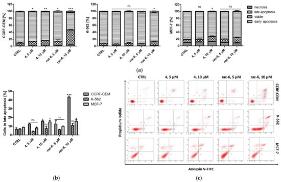 Induction of apoptosis in CCRF-CEM, K-562, and MCF-7 cells. The data were determined by a FACSCanto II flow cytometer after 48 h of treatment with compounds 4 and rac-6. Cells were stained with annexin V-FITC and PI (propidium iodide). (a) Mean and standard deviation (SD) of necrosis, as well as viable, early, and late apoptosis, as percent from three independent experiments each. (b) Percentage of late apoptosis in CCRF-CEM, K-562, and MCF-7 cells. (c) Representative cytograms. The data for viable cells (a) and in late apoptosis (b) were analyzed by Dunnett’s multiple comparison test as follows: * p < 0.05, ** p < 0.01, and *** p < 0.001 relative to control; ns—not significant.