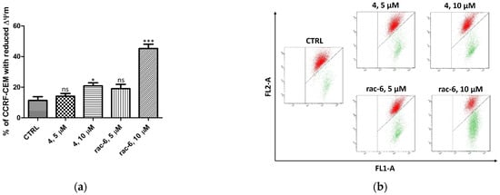Regarding the significant proapoptotic effect of rac-6 on CCRF-CEM cells, in the next step of our investigation, we measured mitochondrial membrane potential (ΔΨm) in leukemia cells treated with compounds 4 and rac-6 for 48 h (Figure 5). Incubation with the tested compounds caused mitochondrial membrane depolarization in a dose-dependent manner (as evidenced by the shift from a red to green fluorescence ratio). The most significant effect, i.e., 45% of cells with reduced ΔΨm, was obtained in cells treated with 10 µM conc. of rac-6. The results correlate well with annexin binding studies of rac-6-treated CCRF-CEM cells, suggesting the intrinsic nature of the apoptotic pathway.
