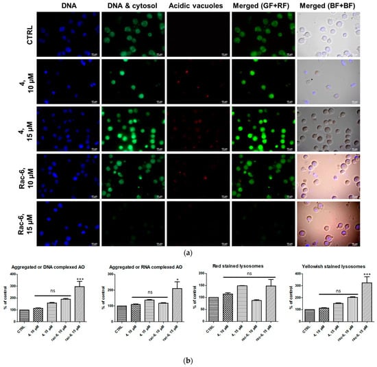 K-562 cells were seeded in 6-well plates at 2.5 × 105/mL and subjected to the tested compounds. After 48 h of incubation, cells were centrifugated at 200× g at 4 °C for 5 min, subsequently suspended in PBS containing 2 µg/mL AO and Hoechst 33342, and incubated at 37 °C for 20 min in the dark. Subsequently, cells were centrifugated at 200× g at 4 °C for 5 min, and 150 µL of the sample was measured on dark plates (Sarstedt). The fluorescence intensity of AO at Ex. 502 nm/Em. 520–524 nm (aggregated or DNA complexed form), Ex. 457 nm/Em. 630–644 nm (aggregated or RNA complexed form), Ex. 540 nm/Em. 640–660 nm (red-stained lysosomes), and Ex. 488 nm/Em. 540–550 nm (yellowish stained lysosomes) and that of Hoechst (nuclei, Ex. 361 nm/Em. 497 nm) in K-562 cells was measured with a Synergy H4 Hybrid Multi-Mode Microplate Reader (BioTek Instruments, Inc., Winooski, VT, USA). The data were normalized to the intensity of Hoechst (nuclei, Ex. 361 nm/Em. 497 nm) in comparison to control cells serving as the reference point, showing 100%.