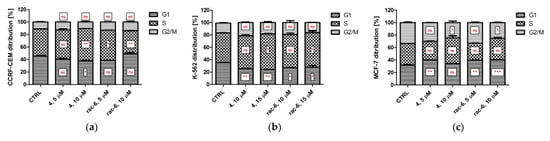 MCF-7, CCRF-CEM, and K-562 cells were cultured in 6-well plates and treated with the tested compounds for 48 h. After exposure to the compounds, the cells were collected and washed with cold PBS and fixed at −20 °C in 70% ethanol for at least 24 h. Subsequently, cells were washed in PBS and stained with 50 μg/mL PI (propidium iodide) and 100 μg/mL RNase solution in PBS supplemented with 0.1% v/v Triton X-100 for 30 min in the dark at RT. Cellular DNA content was determined by flow cytometry employing a BD FACSCanto II flow cytometer (BD Biosciences, San Jose, CA, USA). The obtained DNA histograms were analyzed using MacCycle software (Phoenix Flow Systems, San Diego, CA, USA) for evaluation of the distribution of the cells in different phases of the cell cycle.