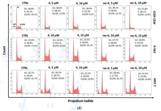 In order to evaluate the proapoptotic properties of rac-6, we analyzed annexin V-binding to phosphatidylserine using flow cytometry. The results are shown in Figure 4 and Table S2. The obtained results indicate that rac-6 induced apoptosis in CCRF-CEM at both concentrations, with the highest proportion of 47% of cells in early and late apoptosis after treatment with 10 µM conc. The examined racemate, rac-6, also induced apoptosis in MCF-7 cells at 10 µM conc. (statistically significant result), whereas K-562 cells were the least sensitive to rac-6 (no significant apoptosis observed). However, the percentage of total apoptotic K-562 cells was higher after treatment with 10 µM conc. of rac-6 than after treatment with parental compound 4 (DMAT), with values of 15.5% and 8.7%, respectively. We also observed the unusual presence of two different pools of unstained cells (considered alive) that were especially visible on cytograms obtained for K-562 cells treated with 10 µM conc. of rac-6 (Figure 4c). The results obtained for this line utilizing flow cytometry suggest a mechanism of death induction other than apoptosis for rac-6.