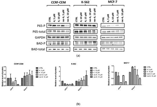The resistance of K-562 cells to the tested compounds correlates well with the lack of apoptosis in these cells after their treatment with rac-6 and 4. Moreover, the poor proapoptotic activity of the tested compounds towards K-562 cells also correlates with the lack of efficient intracellular inhibition of CK2 or PIM-1 protein kinases after 4- and rac-6-treatment. Considering that CK2 has been demonstrated as an essential mediator of BCR-ABL oncogenic signals and the BCR-ABL/CK2 complex is responsible for mediating BCR-ABL-induced cell proliferation and survival [], the lack of efficient intracellular inhibition of CK2 by the tested compounds is in agreement with the poor proapoptotic activity of this treatment. We also observed that the phospho-BAD (Ser112) level in K-562 cells increased significantly after treatment with both inhibitors, which supports cell survival and prevents the occurrence of apoptosis. Moreover, it was demonstrated that the inactivation of BAD by PIM-1-mediated phosphorylation of Ser112 can affect BCL-2, an apoptotic cell death suppressor, which consequently leads to cell survival []. A similarly increased level of phospho-BAD (Ser112) was observed in TNBC MDA-MB-231 cells after treatment with a dual CK2/PIM-1 inhibitor, 1-(β-D-2′-deoxyribofuranosyl)-4,5,6,7-tetrabromo-1H-benzimidazole, named K164 (TDB) []. Interestingly, the same inhibitor reduced the catalytic activity of both CK2 and PIM-1 kinases, as manifested by decreased phosphorylated levels of Akt and BAD in K-562 cells, and induced apoptosis in this cell line [].