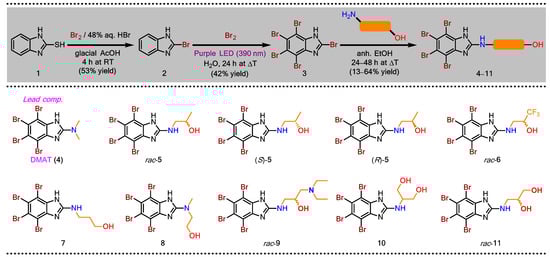 Taking DMAT (4) as the lead compound, a series of dual CK2/PIM-1 inhibitors were designed and synthesized in analogy to the methods already reported in the literature [,]. The general synthetic route is described in Scheme 1. Briefly, in the first step, a commercially available 2-mercapto-1H-benzimidazole (1) was brominated with bromine (Br2) diluted in a mixture of 48% aqueous HBr and glacial acetic acid to afford 2-bromo-1H-benzimidazole (2) in 53% yield. Next, an exhaustive bromination of the resulting 2 with Br2 in boiling water performed under irradiation of purple LEDs (390 nm) for 24 h afforded the desired 2,4,5,6,7-pentabromo-1H-benzimidazole (3) in 42% yield. Finally, the aminolysis of the key intermediate 3 was carried out using the appropriate amino alcohol in anhydrous ethanol in a pressure glass tube reactor at elevated temperatures (110–115 °C) to afford DMAT (4) and its derivatives (5–11) in the yield range of 13–64%.