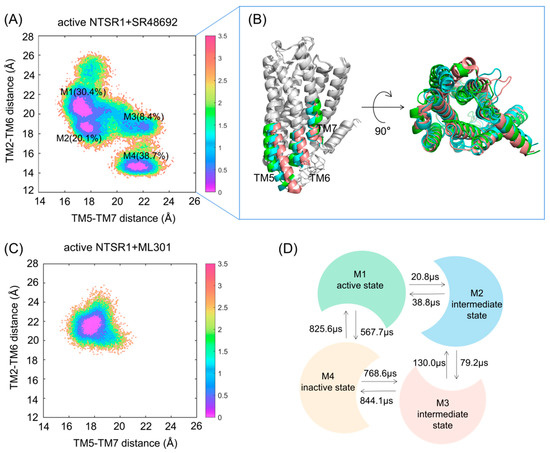 We used K-means clustering to extract five representative conformations from the GaMD trajectories of the active NTSR1 + SR48692 system (Figure 2C) and two representative conformations from the GaMD trajectories of the active NTSR1 + ML301 system (Figure 2D), and we then performed an additional three 500 ns rounds of cMD simulations on the seven systems with each extracted conformation as the initial structure. The RMSD values of the ligands in all simulations were first proven to reach convergence in both systems (Figure S3A) in order to verify the rationality of our docking and simulation. Then, the free energy landscape was depicted using identical CVs. Antagonist SR48692 binding induces the gradual deactivation of NTSR1 through a transition pathway of M1 (the active state, 30.4%)→M2 (the intermediate state, 20.1%)→M3 (the intermediate state, 8.4%)→M4 (the inactive state, 38.7%) (Figure 3A). Significantly, the representative conformation extracted from each energy basin featured typical characteristics of the active state, the intermediate state, and the inactive state, as revealed by the conformational arrangements of TM5, TM6, and TM7 (Figure 3B). A porcupine plot was constructed to graphically visualize the dominant movements of different regions (Figure S3B). The outward shifts of TM5 and TM6 and the inward translocation of TM7 presented the dominant conformational dynamics despite the highly flexible loops. By contrast, agonist ML301 binding stabilized NTSR1 in the active state (Figure 3C). The 2D landscape projected by the TM3–TM6 distance (CV1) and NPxxY RMSD (CV2) illustrated similar results (Figure S3C,D).