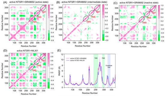 The dynamic cross−correlation matrix analysis of the active NTSR1 + SR48692 system (active state) (A), the active NTSR1 + SR48692 system (intermediate state) (B), the active NTSR1 + SR48692 system (inactive state) (C), and the active NTSR1 + ML301 system (D). Color scales are shown on the right. The interactions whose absolute correlation coefficients are less than 0.3 are colored white for clarity. (E) The RMSF analyses of the active NTSR1 + SR48692 system (pink curve) and the active NTSR1 + ML301 system (blue curve).