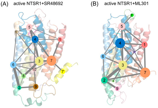 The community network analysis of the active NTSR1 + SR48692 system (A) and the active NTSR1 + ML301 system (B). Each sphere represents a corresponding community whose number of residue components is indicated by the sphere area. Each number denotes a community in the network, and number with a superscript refers to a sub-community. While the sticks connecting different spheres visualize the inter-community connections, and the thickness of these sticks is proportional to the value of edge connectivity.