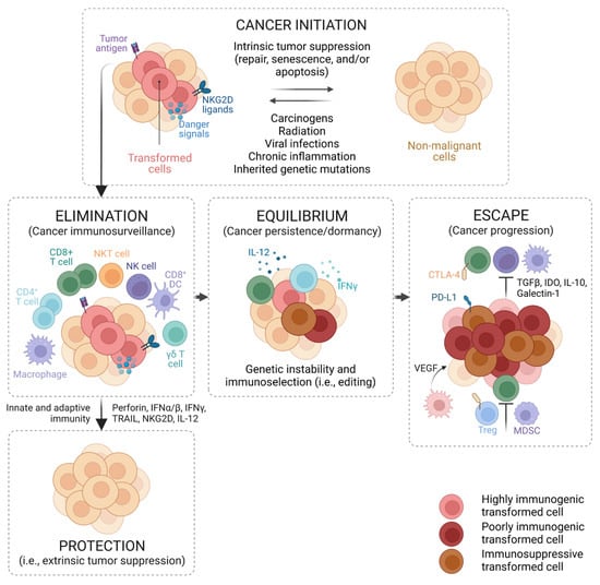 Since the concept of cancer immunosurveillance was first introduced more than a century ago [], researchers have developed the immunoediting theory to explain tumor outgrowth under active immune functions in immunocompetent hosts (Figure 1) []. The host immune cells of innate and adaptive arms, including natural killer (NK) cells, dendritic cells (DCs), macrophages, and T cells, are constantly searching for malignant cancer cells in systemic circulation; this is a process called immunosurveillance, which can ultimately lead to the recognition and elimination of cancer cells via anticancer immune responses [,,]. This initial phase associated with cancer immunosurveillance is called elimination, as it consists of eliminating cancer cells to provide protection against tumor growth. However, the heterogeneity and genetic instability of cancer cells often prevent complete tumor eradication; the constant immune pressure results in the evolution and selection of cancer cell subclones that can resist anticancer immune responses [,,]. Such cancer cell variants may survive immunosurveillance and progress toward the equilibrium phase, where cancer cells remain functionally dormant or continue to evolve into new subclones harboring immune escape mutations such as a loss of antigen presentation and an increased expression of programmed death ligand-1 (PD-L1) [,,]. These immune-edited tumors can then enter the escape phase, where the immune system is unable to control their growth, and the tumors become clinically apparent []. Some tumors may also escape immunosurveillance by recruiting immunosuppressive leukocytes such as regulatory T cells (Tregs) and myeloid-derived suppressor cells (MDSCs), which inhibit anticancer immune cells []. Cancer immunotherapy aims to increase the quality and quantity of anticancer immune cells to newly prime or reinforce existing anticancer immune responses to eliminate tumors in the equilibrium or escape phase. Some key immune cells for anticancer or suppressive immune responses are described below.