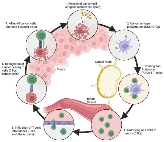 CD8+ T cells or cytotoxic T lymphocytes (CTLs) are the key effector cells for the adaptive immune response, which can directly recognize and eliminate cancer cells in an antigen-specific manner [,]. The multistep immune cell–cancer cell and immune cell–immune cell interactions that are involved in the killing of cancer cells via CTL are referred to as the ‘cancer-immunity cycle’ (Figure 2) []. In the first step of the cycle, cancer cell antigens released by spontaneous cell death are captured by professional APCs such as DCs (possibly accompanied by the co-release and uptake of DAMP-based maturation signals). APCs then process antigen epitopes and present them to CD8+ T cells in the context of MHC I molecules in peripheral lymphoid organs []. Naïve T cells receive an antigenic signal via the T-cell receptor (TCR) and are primed and activated along with the co-stimulatory signals provided by APC maturation []. The activated T cells then migrate and infiltrate the tumor bed, recognize cancer cells via their cognate antigens bound to MHC I molecules, and exert cytotoxic activity for the induction of apoptosis [,]. As a consequence, cancer cells undergo immunogenic cell death, where dying cancer cells can release additional cancer cell antigens and DAMP-based maturation signals for the continued and sustained activation of the cycle [].