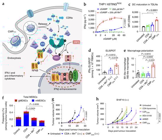 Antitumor activity of CMPCDA. (a) Schematic diagram of the activation of cGAS-STING pathway by CMPCDA. (b) STING activation in THP1 cells expressing hSTINGR232. (c–f) The levels of immune cells and (g) antitumor efficacy of CMPCDA in CT26 tumor-bearing mice. (h) Antitumor efficacy of CMPCDA in B16F10 tumor-bearing mice. Reprinted with permission from [].