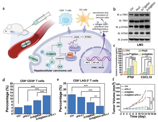 Antitumor activity of ZnS@BSA. (a) Schematic diagram of ZnS@BSA function in a HCC cell. (b) Western blotting analysis of STING marker expression in LM3 cells. (c–e) The levels of cytokines and immune cells in randomly selected tumor samples and (f) antitumor efficacy in HCC tumor-bearing mice. Reprinted with permission from [].