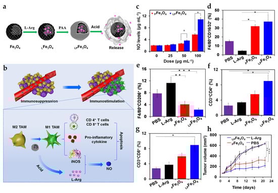 Antitumor activity of LPFe3O4 NPs. Schematic diagram of (a) L-Arg loading and pH-responsive release and (b) M2-M1 macrophage polarization and NO production by LPFe3O4 NPs. (c) NO levels of M2 macrophages treated with different formulations. (d,e) TAM phenotype (CD16/32 for M1 and CD206 for M2, respectively), (f,g) CD4+ and CD8+ T cells, and (h) antitumor efficacy in 4T1 tumor-bearing mice. Reprinted with permission from []. Copyright 2021 American Chemical Society.