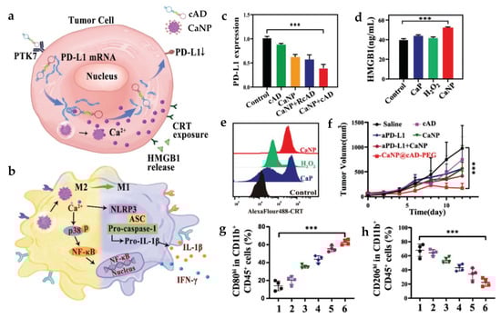 Antitumor activity of CaNP@cAD-PEG. Schematic diagram of (a) CaNP function in a tumor cell and (b) TAM reprogramming via Ca2+ interference. The expression of (c) PD-L1 and (d,e) DAMPs (CRT and HMGB1) in B16 cells. (f) Antitumor efficacy in B16 tumor-bearing mice. The levels of (g) M1 and (h) M2 macrophages. Reprinted with permission from [].