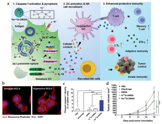 A recent study by Tang et al. described the preparation of sodium-stabilized dendritic mesoporous aluminosilicate nanoparticles (Na-IVAl-DMSN) as DC pyroptosis modulators and antigen carriers for cancer vaccine applications (Figure 7) []. Once internalized by DCs, Na-IVAl-DMSN promoted H+/Na+ exchange in acidic lysosomes in a pH-responsive manner, leading to lysosomal rupture and subsequent Na+ influx/K+ efflux in cells. The intracellular ion perturbation induced caspase-1-dependent DC pyroptosis and inflammasome activation, which triggers the hyperactivation of bystander DCs, a superior state in priming T cells. Consequently, CT26 cancer cell lysate-loaded Na-IVAl-DMSN boosted immune responses in vivo (marked by the high level of activated DCs), cytotoxic NK cells, CTLs, and effector memory T cells, showing strong anticancer efficacy when administered in a prophylactic or therapeutic setting.