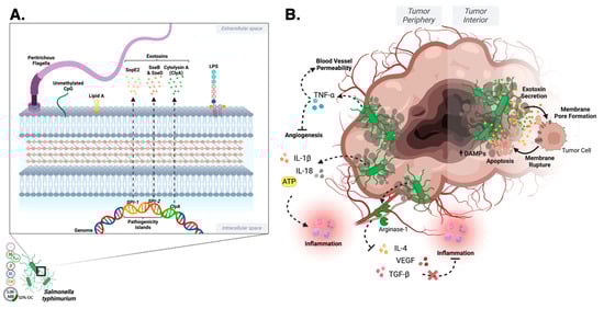 - Leschner, S.; Westphal, K.; Dietrich, N.; Viegas, N.; Jablonska, J.; Lyszkiewicz, M.; Lienenklaus, S.; Falk, W.; Gekara, N.; Loessner, H.; et al. Tumor invasion of Salmonella enterica serovar Typhimurium is accompanied by strong hemorrhage promoted by TNF-alpha. PLoS ONE 2009, 4, e6692. [Google Scholar] [CrossRef]