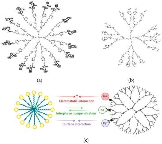 (a) Molecular structure of the G3 glucose-modified carbosilane dendrimer (DDM3Glu). Adapted with permission from []. Copyright 2020, Elsevier. (b) Model structure of the G3 imidazolium-terminated carbosilane dendrimer. Adapted with permission from []. Copyright 2020, Elsevier. (c) Outline of the distinct patterns of interaction exhibited by PAMAM-based dendrimers with different surface terminations (amine, -HN2; acetamide, Ac; and 3-methoxy-carbonyl-5-pyrrolidonyl, Pyr), with SDS micelles. Adapted with permission from []. Copyright 2022, American Chemical Society.