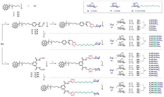Synthetic pathway leading to the different series of G1–G3 glyco-DDMs. Adapted with permission from []. Copyright 2022, American Chemical Society.