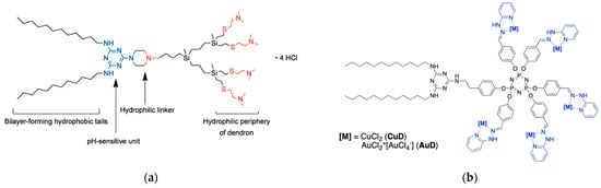 (a) Chemical structure of the triazine-carbosilane amphiphilic dendron that generate dendrimersomes upon self-assembly. Adapted from [], published by MDPI, 2020. (b) Chemical structure of the amphiphilic triazine-phosphorous metallodedron featuring multiple Cu(II) or Au(III) complexes as terminal units. Adapted from [], published by MDPI, 2022.