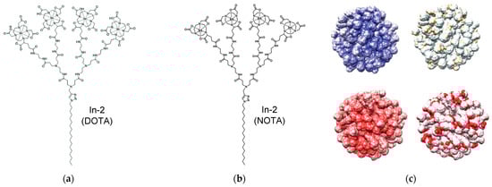 (a) Chemical structure of the self-assembling amphiphilic dendrimers In-2(DOTA) bearing radionuclide In3+ terminals complexes with the macrocyclic DOTA cage. Adapted with permission from []. Copyright 2019, John Wiley & Sons. (b) Chemical structure of the self-assembling amphiphilic dendrimers In-2(NOTA) bearing radionuclide In3+ terminals complexes with the macrocyclic NOTA cage. Adapted with permission from []. Copyright 2020, The Royal Chemical Society, 2020. (c) Top row: electrostatic surface potential (left) and representation of the surface charge distribution localized on the In3+/NOTA complexes at the NOTA terminals (neutral, ivory) (right) for the In-2(NOTA) dendrimer nanomicelles. Bottom row: electrostatic surface potential (left) and representation of the surface charge distribution localized on the In3+/DOTA complexes at the DOTA terminals (neutral, ivory) (right) for the In-2(DOTA) dendrimer nanomicelles. In the top-left and bottom-left panels, the red color represents a negatively charged surface, the dark blue color represents a positively charged surface, while the white color represents a neutral surface, respectively. Adapted with permission from []. Copyright 2020, The Royal Chemical Society.