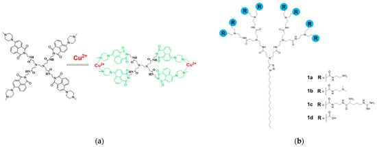 (a) Chemical structure of the metallodendrimer [Cu2(D)(NO3)2]. Adapted with permission from []. Copyright 2021, Elsevier. (b) Chemical structures of the self-assembling amphiphilic dendrimers 1a–d. Adapted with permission from []. Copyright 2022, The Royal Society of Chemistry.