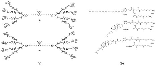 Dendrimers have great potential to create carbohydrate mimics with distinct multivalent cooperation. Thus, researchers from France, Italy, Poland, China, and Taiwan made a collaborative effort to modify the surface groups of the dendrimer bola8a (depicted in Figure 5d) with mannose (Ia) and glucose (Ib) terminals (Figure 11a) []. These dendrimers were easily synthesized by sequential click reactions and exhibited favorable properties such as water solubility and biocompatibility. The unique structure of Ia resulted in a high affinity for the carbohydrate binding protein concavalin A (ConA). Furthermore, Ia specifically targeted the mannose receptor, while Ib selectively targeted the glucose transporter. Both Ia and Ib demonstrated effective uptake by microglia, astrocytes, and cancer cells. Overall, these bola-amphiphilic glycodendrimers show great potential for targeted drug delivery to cells expressing carbohydrate-binding proteins.