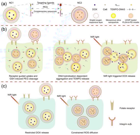 Inspired by the ultrashort action radius of 1O2 and steric hindrance-controlled nanoparticle recognition, we “locked” the anti-cancer drug doxorubicin (DOX) using an 1O2 responsive (SOR) linker in the first nanocarrier (NC1), and encapsulated the 1O2 photosensitizer Chlorin e6 (Ce6) with an upconverting nanoparticle (UCNP) in the second nanocarrier (NC2). After, respectively, coating a paring of total complementary DNA oligos on the NC1 and NC2 surface, polyethylene glycol-modified folic acid (PEG-FA) or PEG-modified RGD peptide (PEG-RGD) were further linked to the 5′ end of the DNA oligo through disulfide bonds (Figure 1a). For HeLa cells overexpressing both folate receptors and integrin αvβ3, NC1 and NC2 can be simultaneously accumulated in HeLa tumor tissues, and can be internalized by HeLa cells in large quantities under the guidance of folic acid and RGD peptides [24,25,26]. Then, DNA hybridization-induced aggregation between NC1 and NC2 is activated by the elevated glutathione (GSH) level in the HeLa cell cytoplasm. Due to the cleavage of the SOR linker through 1O2 produced by near-infrared (NIR) light irradiation, DOX could be rapidly released from NC1 + NC2 aggregation to inhibit HeLa cell proliferation (Figure 1b). For cells overexpressing a single folate receptor, NIR light-triggered DOX release was blocked due to the ultrashort action radius of 1O2 (Figure 1c left). Meanwhile, ROS cytotoxicity for cells overexpressing the single integrin αvβ3 was minimized by the ROS quencher loaded at the NC2 surface (Figure 1c right) [27]. This DLST nanoplatform requires a cascade of endogenous and exogenous stimuli to trigger drug release within cells with a specific membrane protein expression pattern, and can dramatically enhance chemotherapy specificity and pharmacological efficacy during treatment.