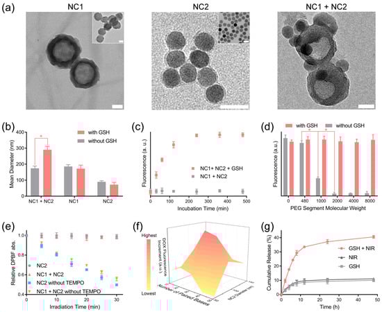 The unmodified MSN had a spherical structure with mesoporous pores. After surface modification, a low-contrast corona structure appeared at the MSN nanoparticle periphery, with a thickness of 9.3 ± 3.2 nm, which demonstrated the formation of a functional biopolymer layer at the MSN surface (Figure 2a left). UCNP displayed a high-contrast spherical structure with a diameter of 34.8 ± 3.3 nm according to its TEM image, while a low-contrast layer (thickness 3.4 ± 0.6 nm) representing the PLGA-b-PEI micelle and surface-level coated biopolymers was observed at the UCNP periphery in the TEM image of NC2 (Figure 2a middle). After each surface modification step, both NC1 and NC2 displayed gradual hydration diameter increments (Figure S3a,c), and their surface zeta potential evolved in accordance with the electronic nature of outermost biopolymer (Figure S3b,d). More importantly, NC2 appeared at the NC1 periphery in the TEM image of the NC1 + NC2 mixture treated with 10 mM GSH (Figure 2a right), which proved that NC1 and NC2 can form aggregations in a redox tumor microenvironment [35]. Consistent with the TEM result, the hydration diameter of the NC1 + NC2 mixture enlarged drastically from 173.8 ± 14.1 nm to 290.2 ± 20.6 nm under GSH treatment, while the hydration size enlargement was not observed for the NC1 + NC2 mixture without GSH treatment (Figure 2b). In contrast, the hydration size of NC1 and NC2 shrunk slightly under GSH treatment, which was due to the cleavage of the disulfide bond and the detachment of the PEG-modified ligand from the nanocarrier surface. This further proved that the GSH-activated aggregation effect required the removal of steric hindrance at the nanocarrier surface. Furthermore, the aggregation effect can be blocked by adding free DNA1 (Figure S4a) into the NC1 + NC2 mixture solution, demonstrating that DNA hybridization was the driving force of aggregation.