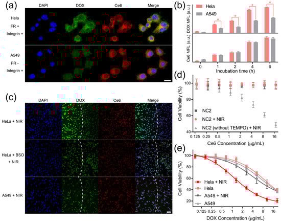 The biosafety of non-drug-loaded MSN was demonstrated by testing HUVECs’ and HeLa cells’ viability after treatment with non-drug-loaded MSN and NIR light irradiation (Figure S9a). To further confirm the eliminated ROS toxicity, NC2 was incubated with HUVECs under different treatments. Due the intracellular diffusion of highly toxic ROS, the HUVECs’ proliferation was dramatically inhibited by non-TEMPO-loaded NC2 upon NIR light irradiation. In comparison, the viability of HUVECs incubated with NC2 was well protected from ROS toxicity by TEMPO at the NC2 surface, proving the minimized normal cell toxicity of this synergistic targeting drug delivery system (Figure 3d). Notably, similar viability trends were observed for HeLa cells under the same treatment, which demonstrated that ROS toxicity can also be eliminated in the tumor microenvironment (Figure S9b). For investigating the in vitro anti-tumor performance of DOX, HeLa cells and A549 cells were treated by NC1 with gradient concentrations and NC2 with a fixed concentration (equivalent to 17.6 μg/mL Ce6). Upon NIR light irradiation, HeLa cells exhibited acute cytotoxicity with a half-maximal inhibitory concentration (IC50) of 2.23 μg/mL DOX, which was reduced by 81.7% relative to HeLa cells without NIR light irradiation (IC50 12.21 μg/mL DOX). In comparison, NIR light irradiation could only reduce the DOX IC50 of A549 cells by 19.0% (from 11.16 μg/mL to 9.04 μg/mL), demonstrating significantly reduced toxicity to folate receptor-negative cells (Figure 3e). A similar phenomenon was observed for HeLa cells, with their integrin αvβ3 being blocked by 10 μM RGD peptides [38,39]; their DOX IC50 only reduced by 13.5% (from 11.88 μg/mL to 10.28 μg/mL) under NIR light irradiation (Figure S9c). Furthermore, HeLa cells’ cyto-toxicity enhancement can also be blocked by buthionine sulfoximine (BSO) treatment (Figure S9d), which demonstrated that the redox tumor microenvironment was indispensable to activate cascade-responsive DOX release.