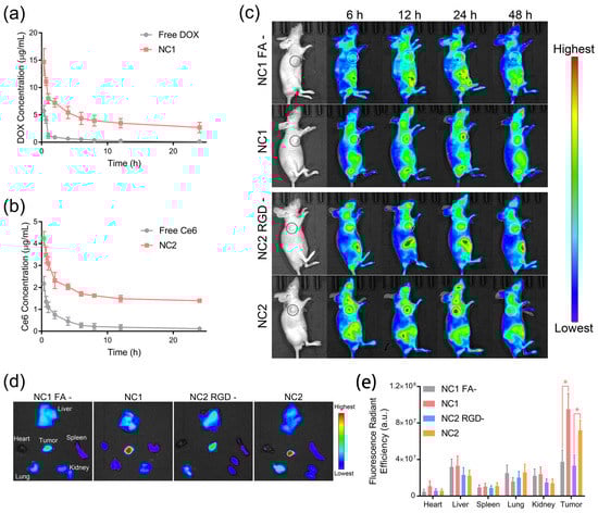 To evaluate the pharmacokinetic properties of NC1 and NC2, female Sprague Dawley mice were intravenously administrated with nanocarriers or free drugs. As shown in Figure 4a, NC1 displayed significantly prolonged blood circulation with an elimination half-time (T1/2) of 2.97 h, which was 3.8 times higher than free DOX. A similar trend was observed for NC2 and free Ce6, which, respectively, possessed a T1/2 of 4.79 h and 1.19 h (Figure 4b). The prolonged blood circulation performances of NC1 and NC2 were also confirmed via the investigation of other pharmacokinetic parameters, including time to reach maximum concentration (Tmax), maximum concentration (Cmax), area under the curve (AUC), mean residence time (MRT) and total clearance (CL) (Table S2). Then, the tumor-targeting properties of NC1 and NC2 were analyzed using the in vivo fluorescence images of nanocarrier-treated HeLa tumor-bearing female BALB/c nude mice. Taking advantage of their prolonged nanocarrier blood circulation, NC1 and NC2-treated nude mice showed gradually enhanced fluorescence signals at the tumor site within the first 24 h after intravenous administration (Figure 4c). Notably, non-FA-modified NC1 and non-RGD-modified NC2 exhibited negligible fluorescence signals enhanced in the same time interval, indicating ligand–receptor interactions were the main driving force of nanocarrier-specific accumulation. Moreover, the fluorescence signals at the tumor site dropped dramatically for all mice 48 h after administration, which indicated the consumption of drugs by tumor tissues, as well as the clearance of circulating nanocarriers by the reticulo-endothelial system. Ex vivo fluorescence imaging experiments were performed 24 h after i. v. administration, when NC1 and NC2 possessed the maximum in vivo fluorescence signals at the tumor site. In accordance with in vivo results, HeLa tumor tissues treated with NC1 and NC2 possessed more dramatically elevated fluorescence signals than other major organs, as well as tumor tissues treated by none-ligand-modified nanocarriers (Figure 4d). On the contrary, a similar fluorescence radiant efficiency was observed in the major organs of nude mice treated with various nanocarriers (Figure 4e), which demonstrated the specificity of targeted delivery. Furthermore, increments in ex vivo fluorescence signals were only observed for A549 tumor tissues treated with NC2, while minimized fluorescence signal increments were shown for A549 tumor tissues treated with NC1 (Figure S10); these results are consistent with the A549 cell membrane protein pattern.
