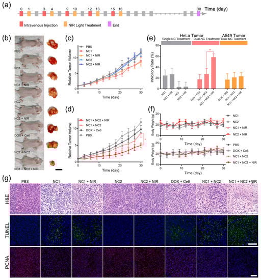To evaluate the in vivo anti-cancer efficacy of the NC1 + NC2 mixture, HeLa tumor (150 mm3)-bearing female BALB/c mice were randomly divided into eight groups (n = 6) and were administered with PBS, DOX + Ce6, NC1, NC2, and NC1 + NC2 at equivalent DOX (2 mg/kg) and Ce6 (2 mg/kg) concentrations every three days via the tail vein on five occasions. For the NC1 + NIR, NC2 + NIR, and NC1 + NC2 +NIR groups, tumors were irradiated upon 980 nm light (1 W/cm2, 10 min) 24 h after each administration. The tumor volume [V (mm3) = 0.5 × length (mm) × width2 (mm2)] and mice body weight of each group were recorded every 3 days. All mice were euthanized 30 days after initial treatment. Major organs and tumors were dissected, washed with PBS and fixed in 4% polyformaldehyde for H&E, TUNEL, and PCNA analyses. To evaluate the dual-receptor-dependent in vivo anti-cancer performance of the NC1 + NC2 mixture, A549 tumor-bearing mice were treated with PBS, DOX + Ce6, NC1 + NC2, and NC1 + NC2 + NIR groups the same way as the HeLa tumor-bearing mice, and were sacrificed for histological analyses 18 days after initial treatment.