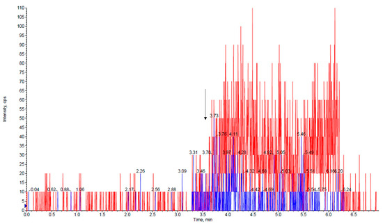 v) from 5.01 to 7 min. The mass spectrometry acquisition was performed in multiple reaction monitoring modes. The optimized parameters of the instrument included ion spray voltage, curtain gas, ion source gas 1, ion source gas 2, and temperature with the following setup: 5500 V, 35 psi, 45 psi, 50 psi, and 600 °C, respectively. Nitrogen flow was generated by a gas generation system (nitrogen generator model Genius ABN2ZA, PEAK Scientific., Scotland). LC-MS/MS control and data acquisition were performed using Analyst software version 1.6.3, whereas LC-MS/MS data processing was carried out using MultiQuant software version 3.0.2 (Applied Biosystems Sciex, Darmstadt, Germany).