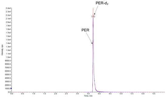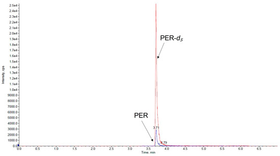 PER was a gift from Eisai (Eisai Co Ltd., Kashima, Japan). Internal standard (IS) PER-d5 and Mitra® VAMS devices were purchased from B.S.N. (B.S.N. srl R&D Laboratory, Castelleone, Italy). Ultrapure water was obtained by means of a Millipore-Q-plus system (Millipore, Milan, Italy). LC-MS grade methanol, acetonitrile, and 99% formic acid were purchased from VWR (VWR International, Radnor, PA, USA). Dimethylsulfoxide (≥99.5%) was purchased from Sigma Aldrich (Sigma Aldrich, St. Louis, MO, USA). For the validation of the method, drug-free human saliva was obtained from healthy volunteers. Participants were instructed to abstain from consuming food or beverages for a duration of 30 min prior to sample collection and to rinse their mouths with plain water. Saliva was obtained using an unstimulated passive drool technique for sampling. The oral fluid was then aspirated with a syringe and transferred into 2 mL polypropylene tubes.