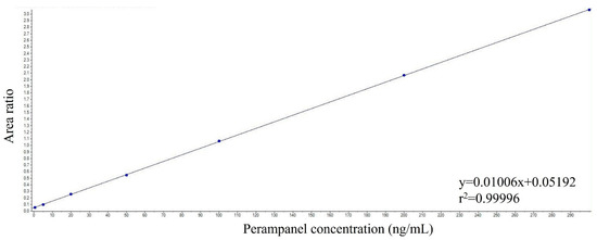 For linearity, calibration curves were prepared using calibrators containing PER at 0.5, 5, 20, 50, 100, 200, and 300 ng/mL and were constructed by plotting the PER/IS peak area ratios against the nominal PER concentrations in the calibrators. The calibration curves were computed without weighing and all data underwent linear regression analysis. The correlation coefficient was employed as an indicator of the quality of the fit. To evaluate the sensitivity of the method, the limit of quantitation (LOQ) and the limit of detection (LOD) were determined. The LOQ was defined as the minimum concentration of calibrators that yielded a signal-to-noise ratio of at least 10. It was considered acceptable if the coefficient of variation (CV%) was below 20% and the accuracy fell within ±20%. On the other hand, the LOD was determined as the concentration of calibrators with a signal-to-noise ratio of at least three. Within-run and between-run precision and accuracy were evaluated at four concentrations corresponding to the LOQ, low QC, medium QC, and high QC, and were determined by measuring the LOQ and QC samples on one day (n = 5) and the LOQ and QC samples on three different days (n = 15), respectively. Precision was expressed as CV% and the assay was considered acceptable if the CV at each concentration was less than 15%. The accuracy was determined by comparing the average values of the LOQ and QCs assay results with the nominal concentrations and results should be within 15% of the nominal values. The evaluation of extraction recovery was conducted using four different concentrations (LOQ, low QC, medium QC, and high QC) and it was assessed by comparing the peak area of PER obtained in VAMS spiked samples before extraction (n = 5) and the peak area of PER obtained in VAMS spiked samples after extraction (n = 5).