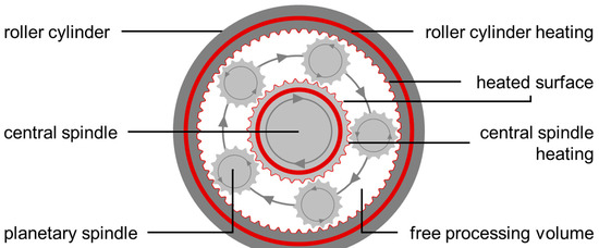 A firmly locked roller cylinder surrounds a motor-driven central spindle. Both parts have a 45° toothing and individual heating systems to regulate the energy input over the heated surface. The implemented planetary spindles determine the free processing volume. Within the processing section these are free-flowing and have to be distributed symmetrically across the radial cross-sectional area due to stability reasons. The minimum number is three in any case, while the maximum number depends on the apparatus size. During processing, the movement of the central spindle is superimposed onto the planetary spindles due to the toothing matching the other main parts. The resulting overall direction of circulation of the planetary spindles is concurrent to the central spindle, while its self-rotation is counter current. This radial movement pattern, in addition to the axial conveying related to the 45° toothing, defines the material transport characteristics during processing. The enhanced ratio of heated surface to free processing volume is beneficial in terms of temperature control. This is relevant for melt granulation, which is based on the softening or melting of the utilized binder component and the processing of temperature-sensitive materials.