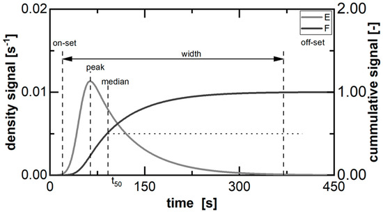 The characteristics of an RTD (Figure 2) provide information on the sub-processes occurring during melt granulation, including the melting of the binder and the granulation mechanisms [29]. The on-set is the point in time of the first discharged material after entering the process at t = 0. Therefore, the time interval in between is the minimum duration of the material in the process. Thus, a temperature above the binder’s melting point has to be obtained in order to start the granulation. The off-set symbolizes the latest discharge of material after entering the process at t = 0. Therefore, the time interval in between is the maximum duration of applied shear and thermal stress to the material. This has to be considered in the context of breakage mechanisms during granulation [29] or thermal material degradation. The width as the time span between the on-set and off-set of the distribution reflects the overall back-mixing of the material during processing. This is crucial for the fundamental particle growth mechanisms [29]. Furthermore, the kinetic between peak and off-set is usually referred to as material “wash-out” and prolonged in comparison to the “loading” kinetic between on-set and peak. The median is representative for the overall RTD and average transport velocity.